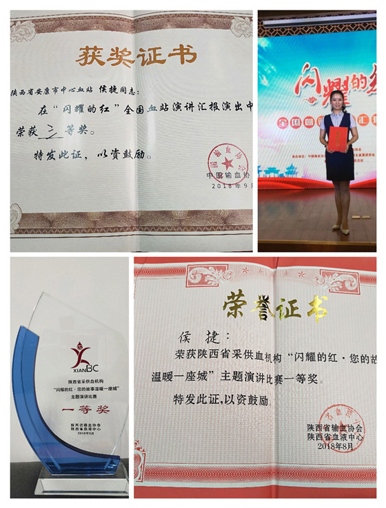 我站血源管理科侯捷同志,根據自己血站崗位工作成長經歷,結合血源一線招募典型事例,充分展示安康無償獻血招募宣傳模式,以“成長在生命年輪中的信仰”為題,代表安康市中心血站參加陜西省“閃耀的紅--您的故事溫暖一座城”血站系統(tǒng)演講比賽,以獨特的視角和演講效果奪得冠軍,并選派于9月21日代表陜西省采供血行業(yè)參加“閃耀的紅”全國血站演講比賽榮獲三等獎,是我站首次在全省、全國演講比賽中取得的最佳成績,為我站在全國范圍內贏得了榮譽,為安康、陜西血站行業(yè)系統(tǒng)爭了光,在全國血液行業(yè)內展示了我站職工昂揚向上的精神風貌。
