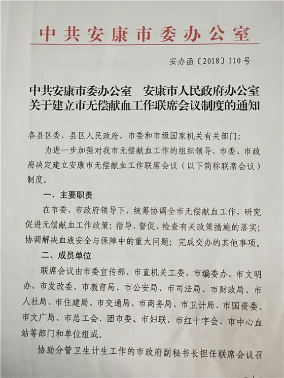 2、安康市率先在全省建立首個無償獻血聯(lián)系會議制度 安康無償獻血聯(lián)席會議制度是在安康市委、市政府領導下,由市委宣傳部等21個市級部門和單位組成,協(xié)助分管衛(wèi)生計生工作的市政府副秘書長擔任聯(lián)席會議召集人。聯(lián)席會議每年召開一次全體會議,主要職責為統(tǒng)籌協(xié)調全市無償獻血工作,研究促進無償獻血工作相關政策,指導、督促、檢查有關政策措施的執(zhí)行落實,協(xié)調解決血液安全與保障中的重大問題。聯(lián)系會議制度的建立,標志著我市無償獻血宣傳招募模式“政府主導、部門協(xié)作、社會參與、城鄉(xiāng)聯(lián)動”的發(fā)展格局和長效機制得到進一步鞏固和提升。