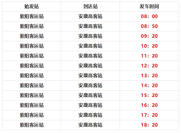 由安康高速客運站發(fā)往紫陽汽車站,每日12班,發(fā)車時間為:?