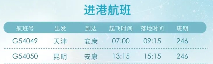 12月26日起,安康富強機場新增“安康=昆明”“安康=天津”航線。具體航線航班如圖: