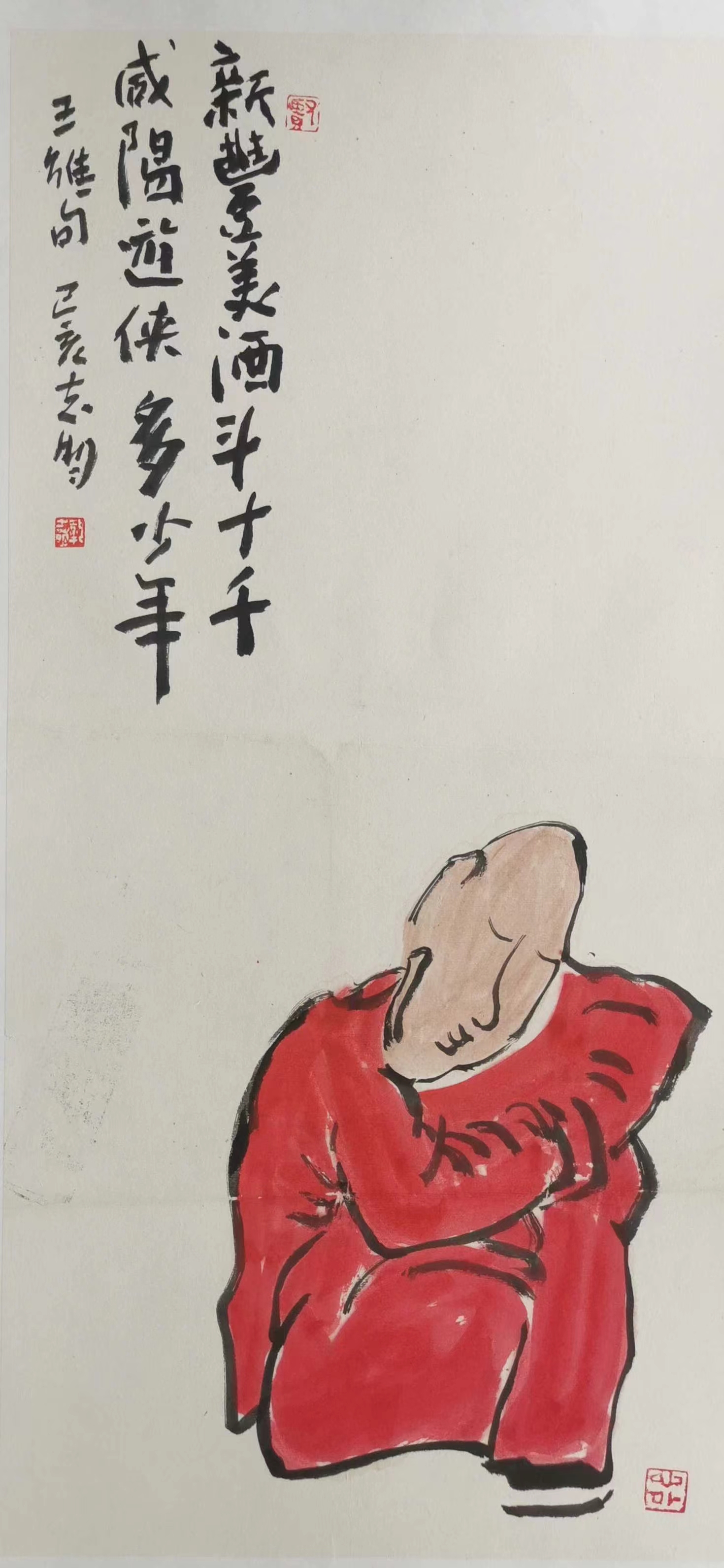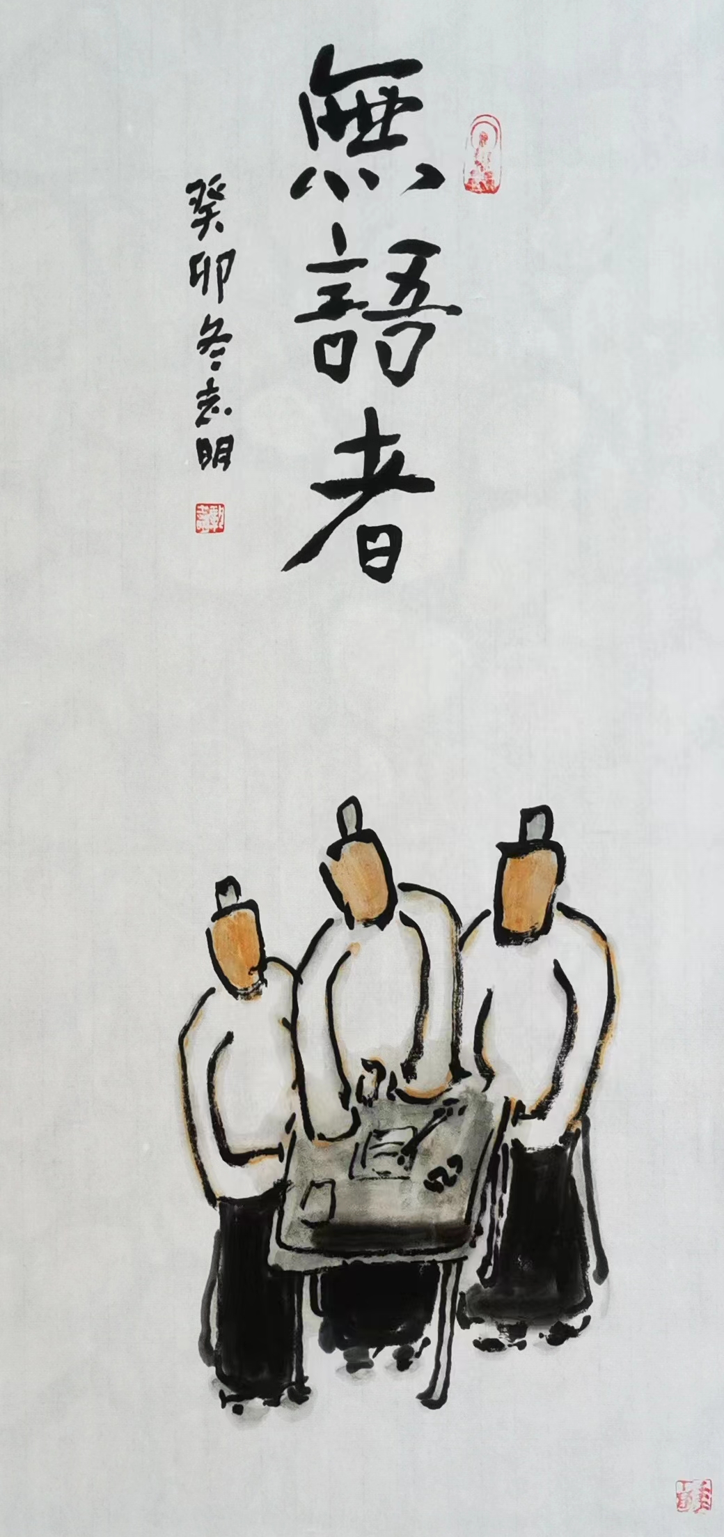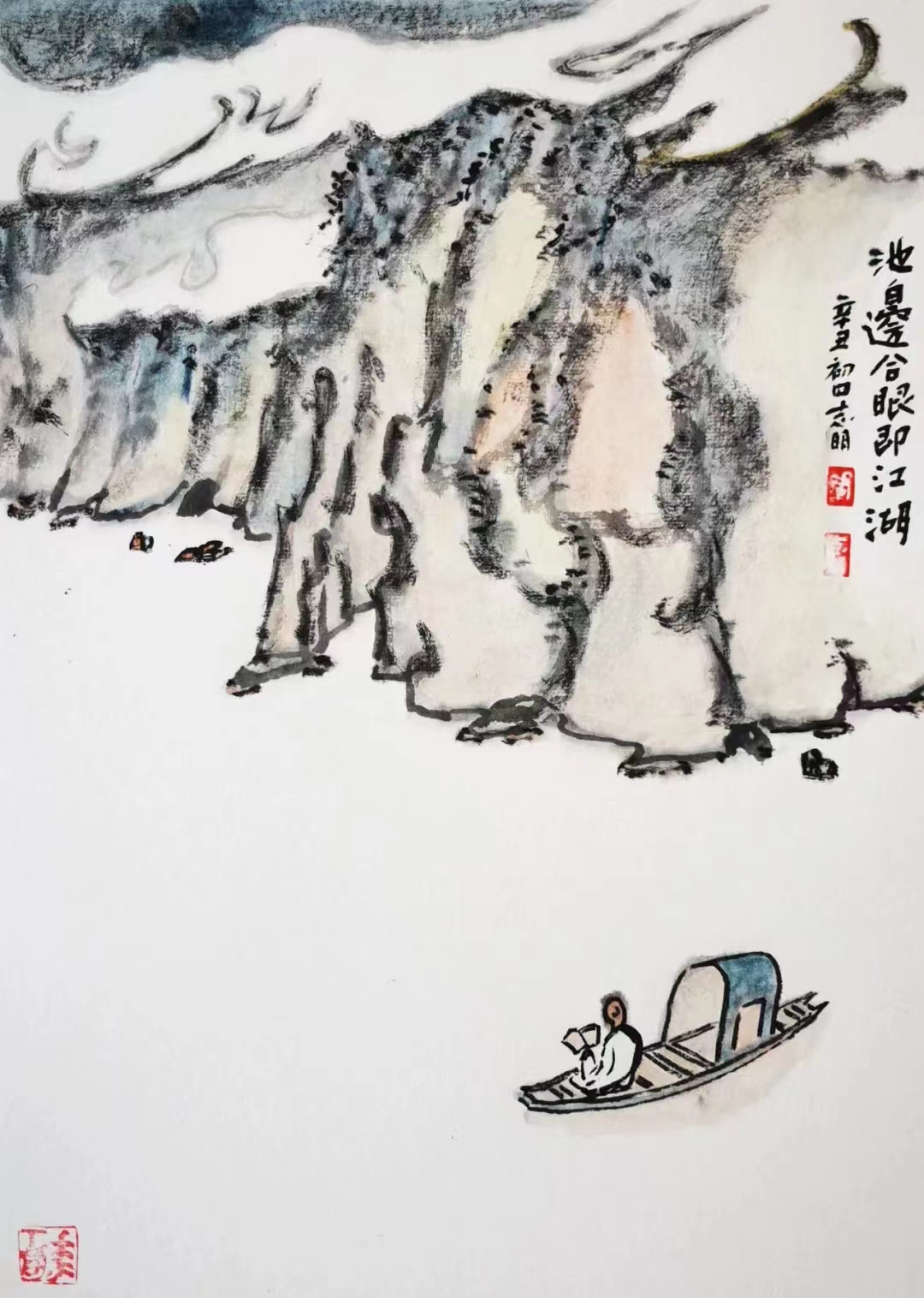 記得那一年的端午節(jié),鞏志明發(fā)來(lái)短信,是他寫的一首詩(shī):綠粽黃酒聚江邊,白帆紅燭祭屈原。三千清淚流不得,九萬(wàn)渾念飄上天。誰(shuí)有郁悶誰(shuí)散淡,何謂圓滑何忠奸。十丈風(fēng)塵古今在,談笑真?zhèn)位聼煛?017年,我遷新居,鞏老師為我寄來(lái)小品畫《福到眼前》,我很喜歡,并懸掛至新居玄關(guān)。這些年,鞏志明老師常做影展畫展策劃及影評(píng)講座,自已也臨池不輟,水墨丹青,寄情抒懷,他的文人小品有思想性、有創(chuàng)造性。雖畫的是松風(fēng)明月,小舟流水或遠(yuǎn)古人物,但都寄托了他當(dāng)下的心境,以消塊壘。誠(chéng)如有人評(píng)論他為“吾師真文人,畫亦真性情!”他不僅只是身居畫室的怡情文人,他亦是心憂天下的豪俠。面對(duì)世間不平事,他也是激揚(yáng)文字,揮斥方遒!在功利的當(dāng)下,鞏志明尤其顯得難能可貴!?