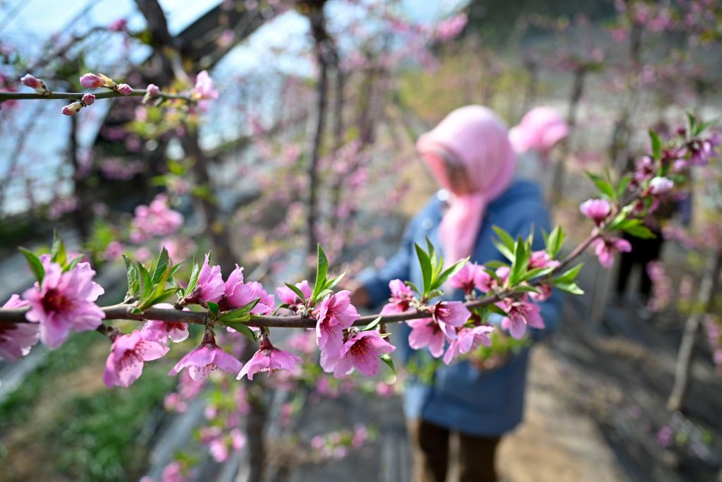 2月24日,在云南省文山壯族苗族自治州文山市馬塘鎮(zhèn)珍珠蜜桃基地,農(nóng)民辛勤護(hù)理桃花。春回大地,各地?fù)屪マr(nóng)時,田間地頭一片繁忙勞作的景象。新華社發(fā)(熊平祥攝)