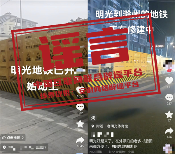 真相:近日,網(wǎng)民“張**”“沙**”等發(fā)布視頻,編造并傳播“明光地鐵已開始動工”相關虛假信息,并配以誤導性視頻,引發(fā)關注和討論。經(jīng)核實,相關視頻內(nèi)容對應區(qū)域施工項目并非修建地鐵,網(wǎng)傳視頻系謠言。明光市委網(wǎng)信辦和市公安局已依法對張某、沙某等進行批評教育,并要求其刪除相關不實信息。(來源:“安徽省互聯(lián)網(wǎng)違法和不良信息舉報”微信公眾號、明光市委網(wǎng)信辦)