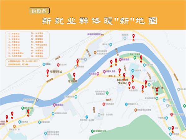 為提升服務(wù)效能,讓更多新就業(yè)群體享受到便捷的暖新服務(wù),旬陽市委社會工作部特別制作了暖“新”地圖,將城區(qū)18處共享驛站具體位置精準標注在地圖上,可一目了然找到距離最近的驛站。此外,暖“新”地圖還提供了旬陽心理咨詢熱線和“12348”法律援助熱線,全方位服務(wù)新就業(yè)群體。?