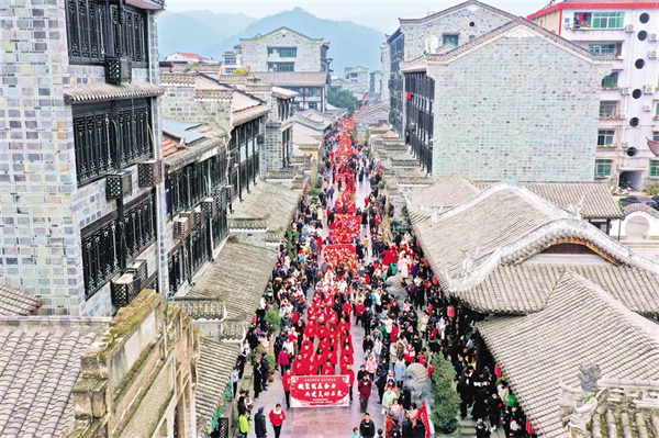 一縷微風穿過,黃昏的老街各種顏色交織碰撞,給人無限遐想。街道兩旁,店鋪一家挨著一家,幾家店外排著長隊,生意火爆。漢服、旗袍走秀、火獅子、舞龍、漢調二黃、花鼓戲入眼入耳?;秀遍g,昔日的場景猶如一幅畫卷徐徐展開。