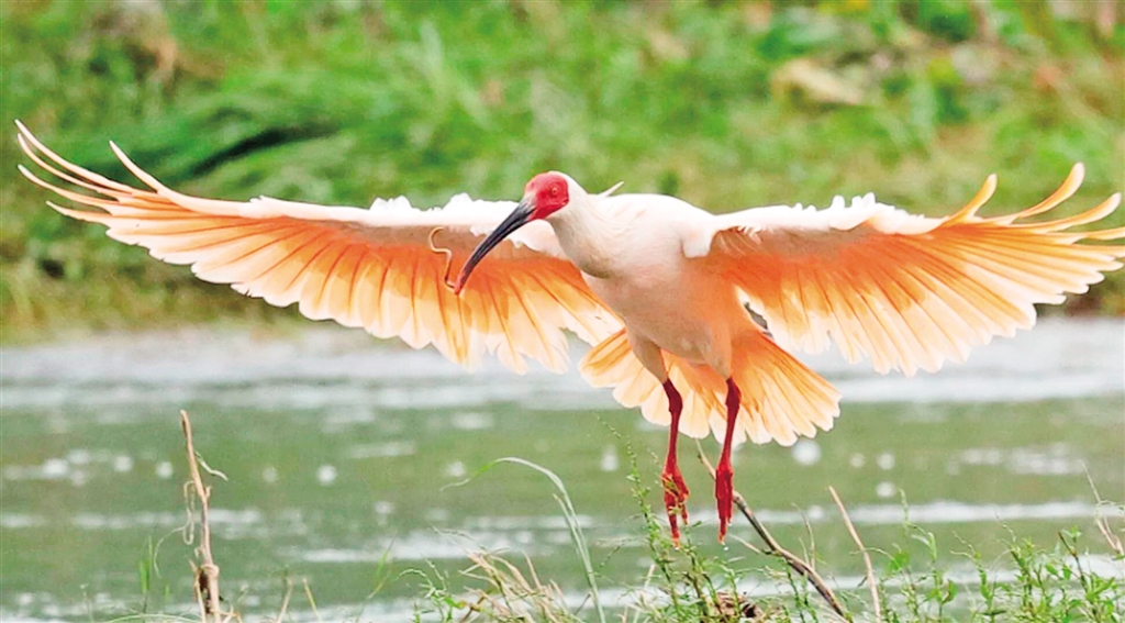 羽毛主要是白色,嘴黑而彎曲,臉和嘴基紅色,翅膀和尾巴粉紅色,腳短且紅色。幼鳥頰部橙黃,腳淺褐色,羽毛呈煙灰色,被譽(yù)為“東方寶石”和“吉祥之鳥”。(來源:安康市林學(xué)會)