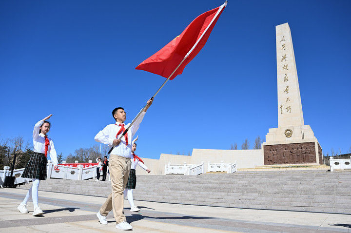 ? 這是2025年4月2日在內蒙古呼和浩特市大青山紅色文化公園拍攝的中國少年先鋒隊出旗儀式。