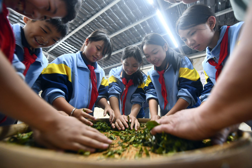 2024年12月3日,學(xué)生們?cè)趶V西梧州市蒼梧縣六堡鎮(zhèn)塘平小學(xué)學(xué)習(xí)制作六堡茶。廣西六堡茶已有1500多年的歷史,其制作工藝被列入第四批國家級(jí)非物質(zhì)文化遺產(chǎn)代表性項(xiàng)目名錄。近年來,廣西圍繞打造千億元茶產(chǎn)業(yè)發(fā)展目標(biāo),深入實(shí)施綠色高效茶園建設(shè)、品牌提升和營銷體系建設(shè)、產(chǎn)業(yè)融合和茶文化提升等多項(xiàng)工程,形成了以六堡茶為引擎,早春茶等特色優(yōu)勢茶協(xié)同發(fā)展的產(chǎn)業(yè)格局,茶產(chǎn)業(yè)煥發(fā)勃勃生機(jī)。六堡茶正沿21世紀(jì)海上絲綢之路運(yùn)達(dá)八方,香飄海內(nèi)外。2024年,廣西六堡茶產(chǎn)量達(dá)到4.3萬噸,綜合產(chǎn)值超300億元。