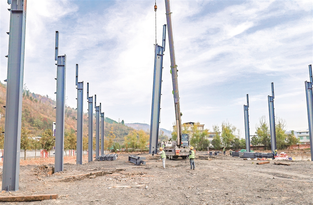 11月26日,紫陽(yáng)高新區(qū)冷鏈倉(cāng)儲(chǔ)物流園項(xiàng)目第一批鋼構(gòu)材料進(jìn)場(chǎng),工人們正在開(kāi)展吊裝作業(yè)。 肖昌尉 攝