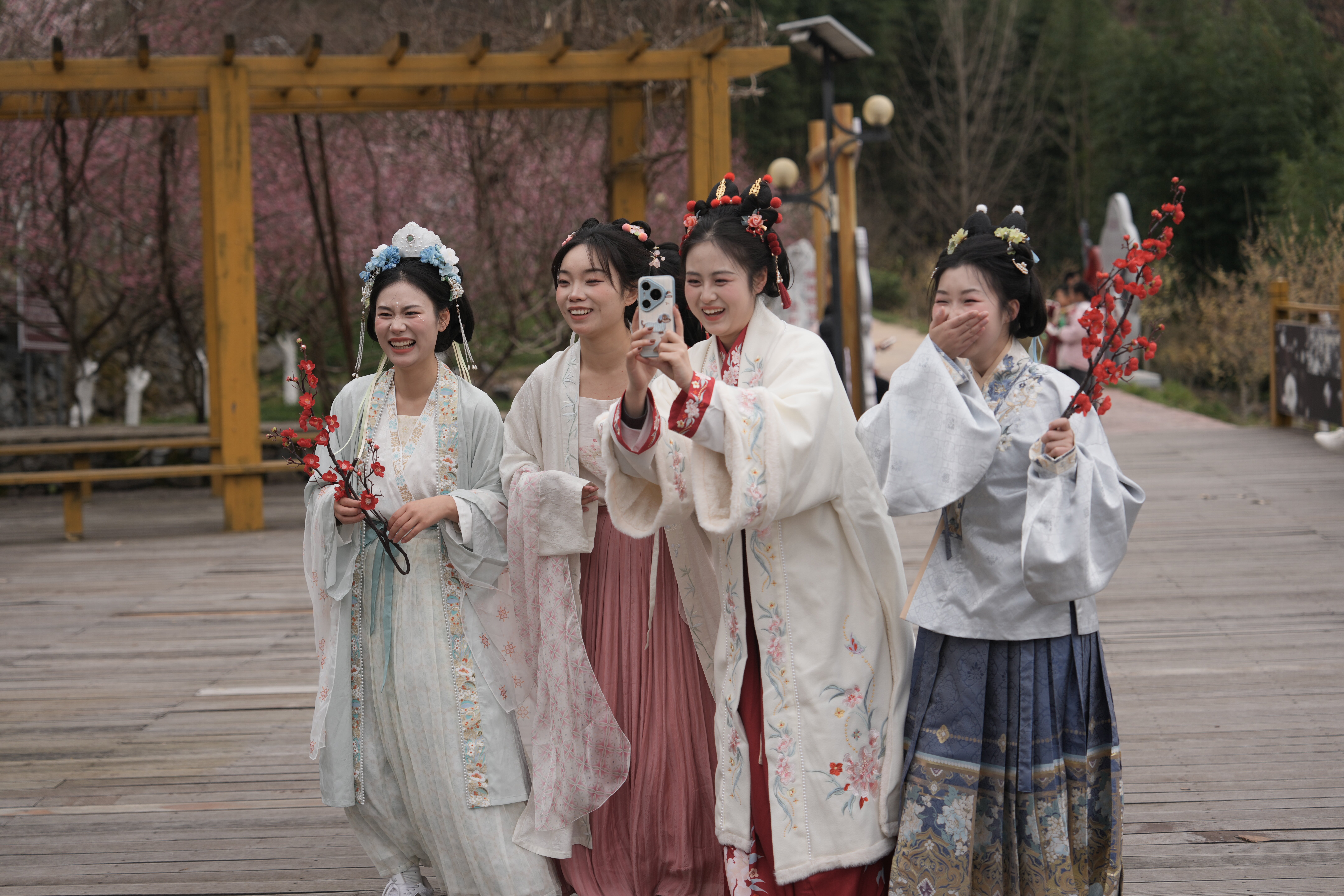 游客穿著漢服在子午梅苑內拍照打卡 陳苗 攝
