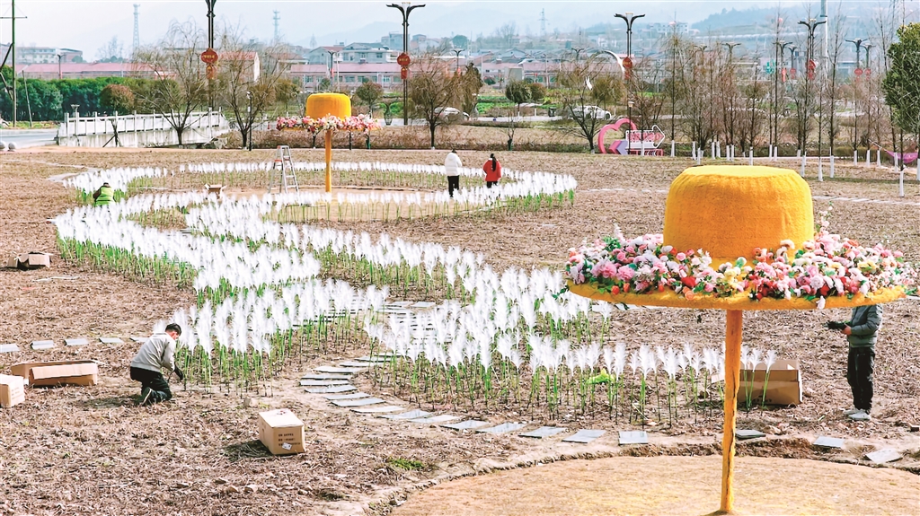 不遠(yuǎn)處的迎賓公園里,另一組工作人員正沿著步道和綠化帶安裝布置蘆葦燈帶。一根根蘆葦狀的燈桿錯落豎立,待夜幕降臨時,將勾勒出公園蜿蜒的輪廓,營造出寧靜溫馨的夜間景致。