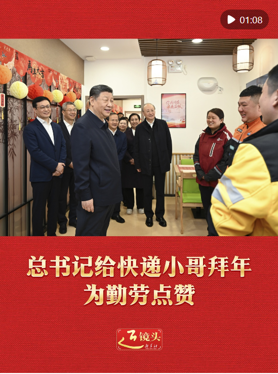 10日上午,習近平總書記在北京考察調(diào)研,走進西城區(qū)新街口街道父母食堂,見到在這里休息的快遞小哥,關切詢問他們的工作和生活,為他們付出的辛勞和作出的貢獻點贊,并給他們拜年。