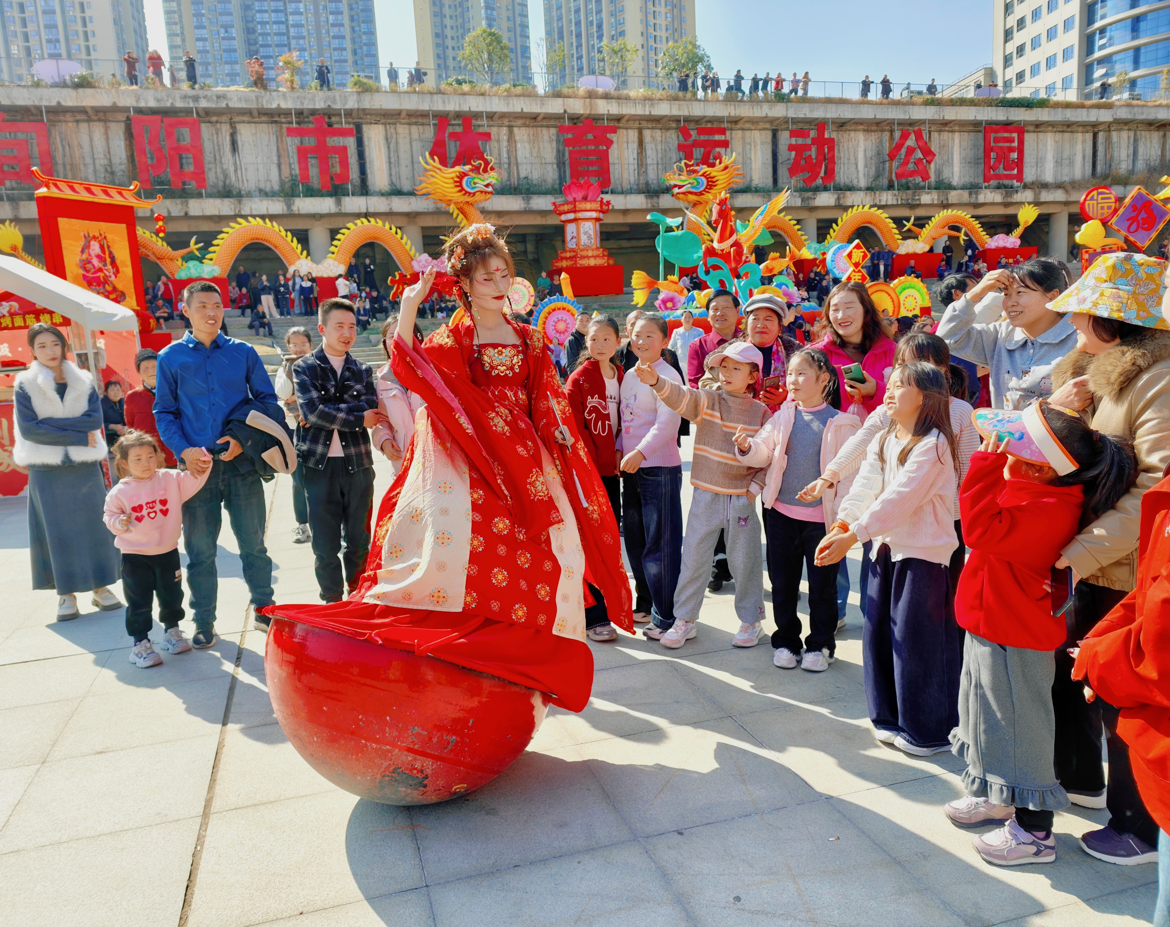 春節(jié)期間,瀛湖漢水街文旅影視基地?zé)狒[非凡。圖為游客們欣賞基地精心準備的表演。張忠 攝