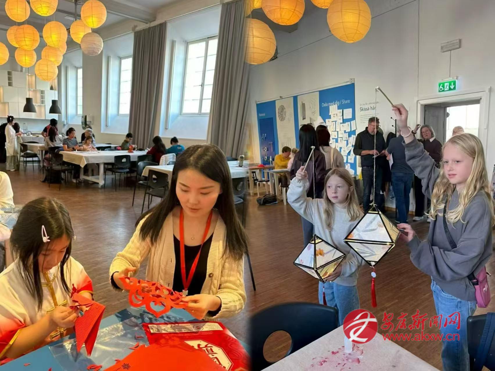 2025年中秋節(jié),邱萌受邀參加哥德堡總領(lǐng)館舉辦的文化活動,在哥德堡市立博物館的展廳里,她教當?shù)睾⒆觽冏鰺艋\、剪剪紙。邱萌和孩子們一起用宣紙折疊成燈籠,讓瑞典人得以近距離觸摸中國節(jié)日。有人好奇地問起中秋的月亮,她便講起嫦娥奔月的傳說,講起月餅的寓意,講起“千里共嬋娟”的詩句。博物館里點亮了許多盞燈籠,每一盞都映照著孩子們專注而好奇的臉龐。
