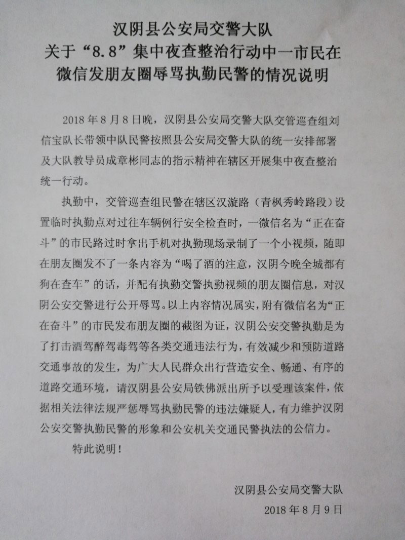 8月8日晚,漢陰縣公安局鐵佛派出所民警接到網(wǎng)友舉報(bào),稱有一名網(wǎng)名叫“正在奮斗”的網(wǎng)友在朋友圈發(fā)布內(nèi)容為“喝了酒的注意,漢陰今晚全城都有狗查車”的辱警信息。接到報(bào)警后,鐵佛派出所民警立即開展行動(dòng),不到48小時(shí),迅速查處一起尋釁滋事案件。經(jīng)調(diào)查,微信網(wǎng)友“正在奮斗”的真名叫郭某全,1985年出生,住漢陰縣城關(guān)鎮(zhèn)某小區(qū),正是發(fā)布該辱警信息的違法行為人。
